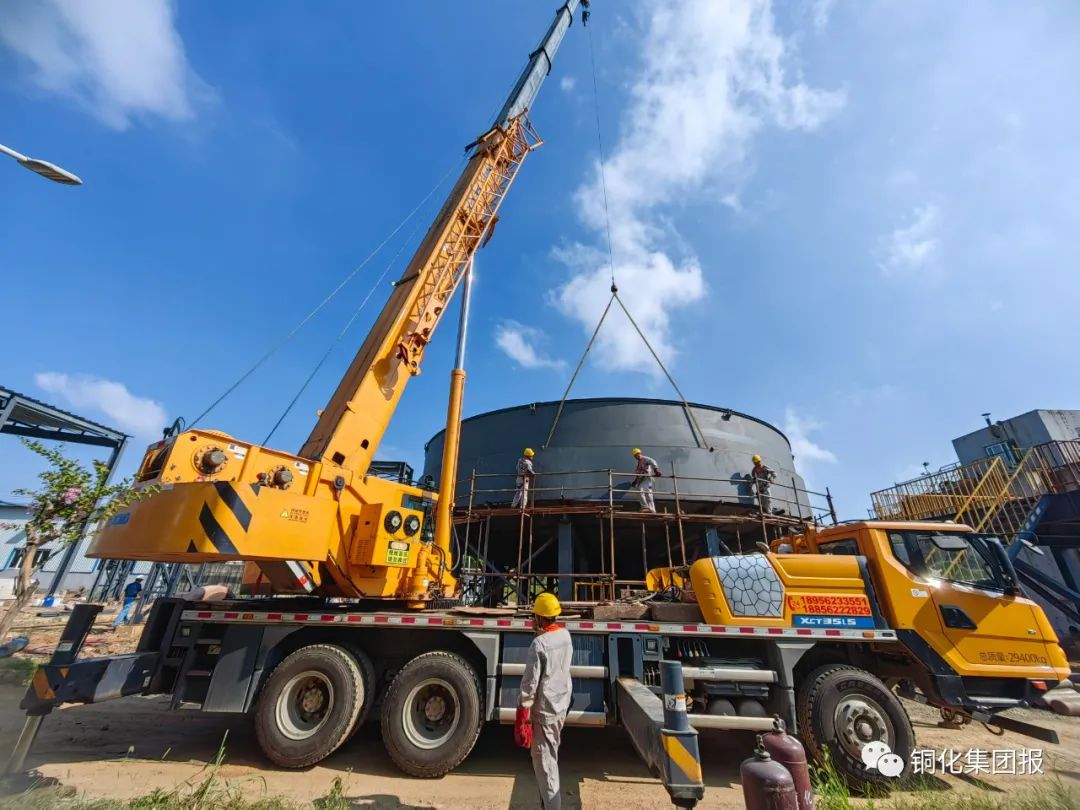 項目完工投用后,每年可處理選礦廢水247.5萬立方米、酸性廢水1000萬立方米,去除COD1485噸、硫化物146.03噸、重金屬錳208噸,在保障原生產(chǎn)線正常運行的同時,顯著降低相關(guān)污染物排放,實現(xiàn)外排水水質(zhì)穩(wěn)定達標,有效保護當(dāng)?shù)厮h(huán)境,環(huán)境效益和社會效益顯著。上圖為吊裝作業(yè)現(xiàn)場。
