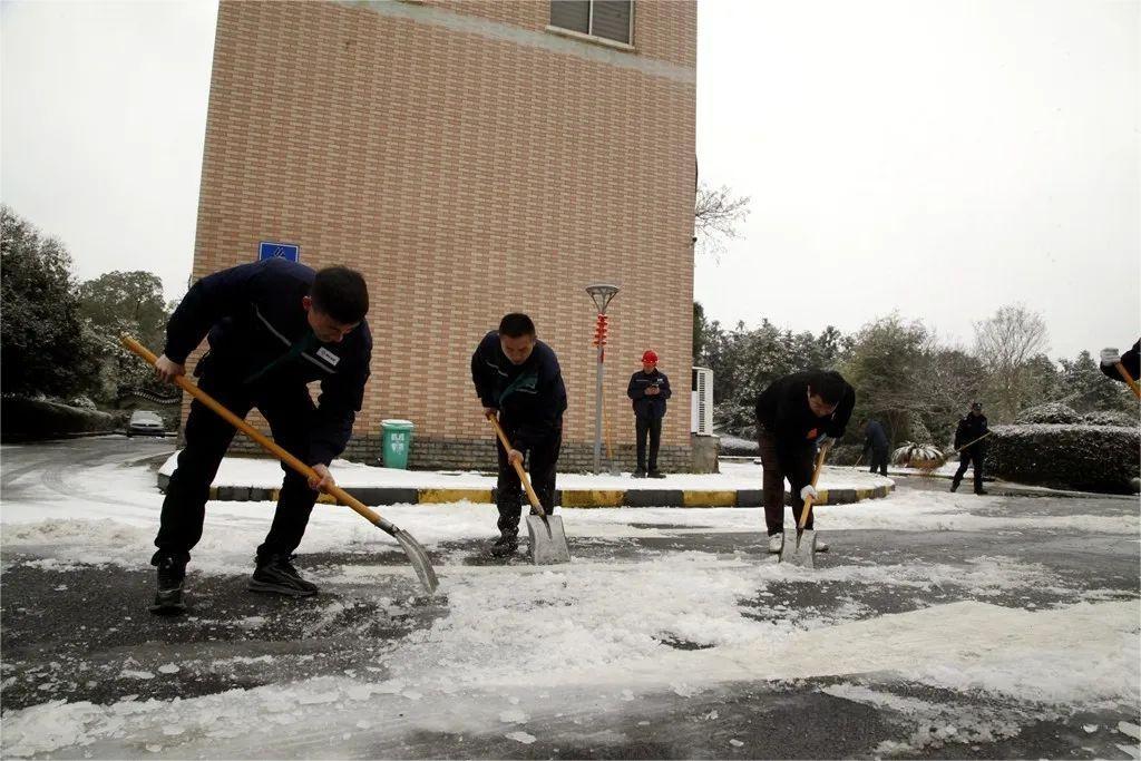 生產(chǎn)管理部組織員工清理辦公樓廣場積雪,確保進(jìn)出員工、車輛安全通行。